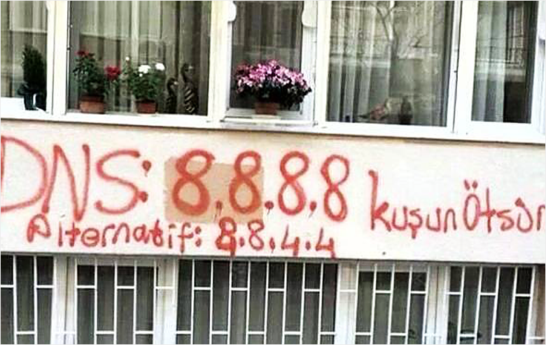 At first, the ISPs used only one technique, DNS poisoning, changing DNS records so that requests for Twitter’s site were redirected to a government webpage. However, as we discussed above, using this strategy alone is easily circumvented by directly using IP addresses or accessing alternative DNS servers. In Turkey, a strange form of graffiti appeared; people began scrawling the addresses for Google’s public DNS servers on walls and in public places.