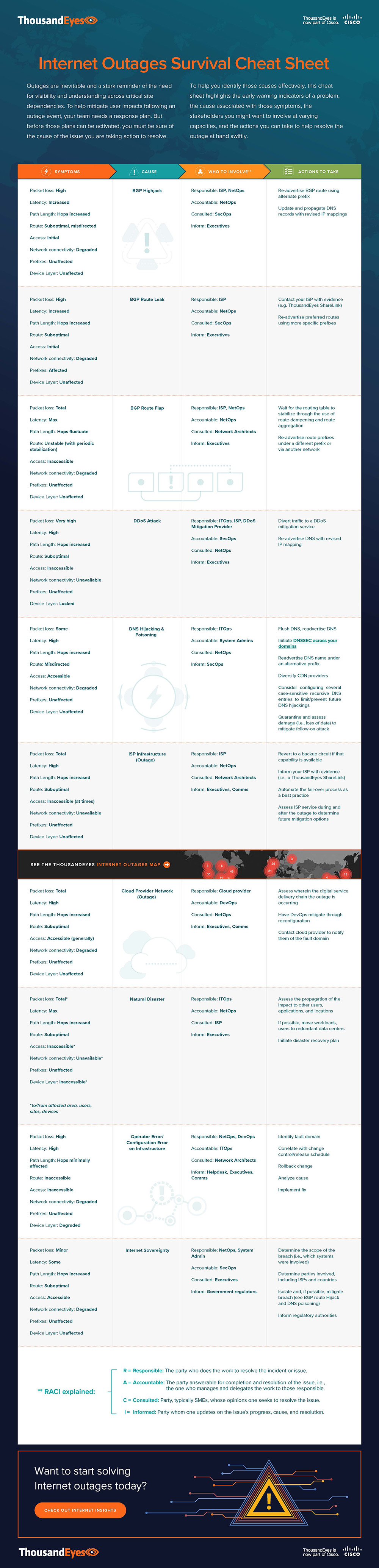 As with any network outage, the cause can be the result of any of the interdependent and interconnected networks or services, making outage root cause analysis (RCA) tricky. These causes can be as simple as a severed fiber optic cable or as sophisticated as a distributed denial-of-service (DDoS) attack. To help you narrow down outages cause effectively, use our Internet Outage Survival Cheat Sheet (the infographic is embedded below). This cheat sheet outlines outage symptoms, key stakeholders and actions to take that will help your network team save the day.