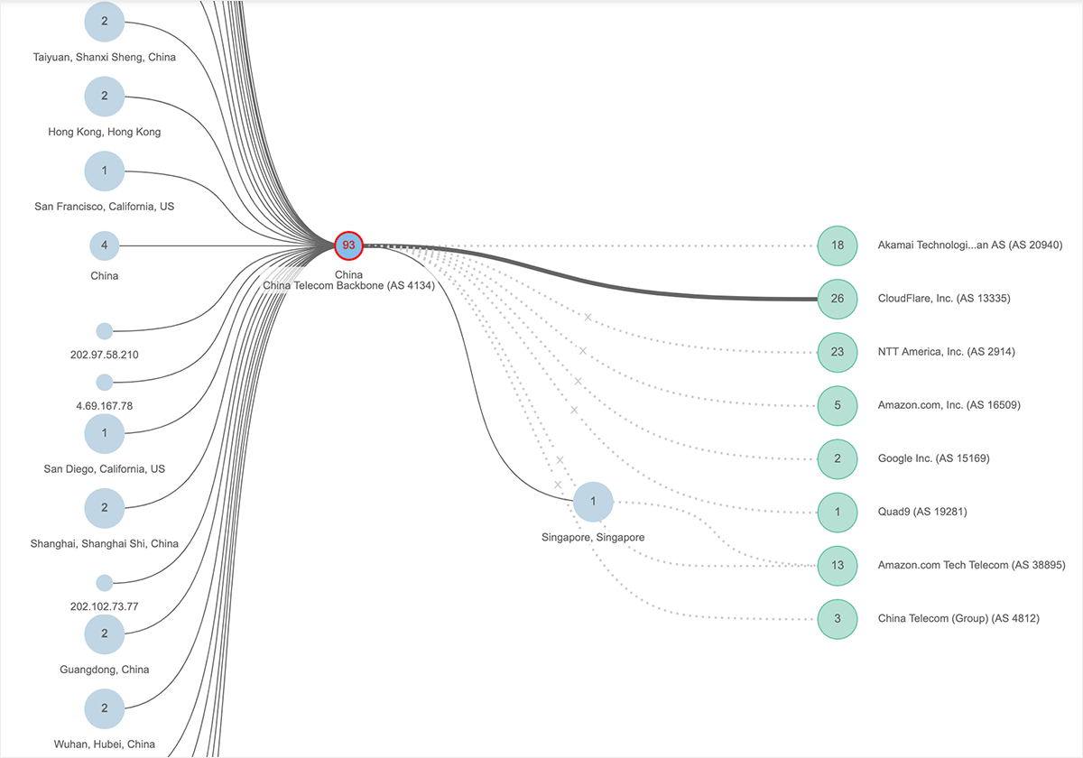 Another U.S.-based service impacted by the outage was Cloudflare’s managed DNS service. For example, WeWork’s domain names are hosted by Cloudflare, and in the Path Visualization below you can see that traffic attempting to access Cloudflare’s DNS servers (represented by the green colored node on the far right with IP address 173.245.58.135—which is part of the routed prefix 173.245.58.0/24 that is geolocated in the U.S.) was dropped by China Telecom routers located within China. The result was that many users from within China couldn’t access WeWork sites.