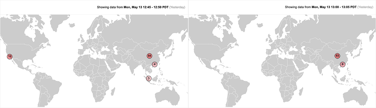 At its peak, we detected over 100 services disrupted as a result of network conditions in China Telecom’s global backbone. We also detected the shifting geographic impact of the outage, as illustrated by the two heat maps below, captured at separate points during the outage.
