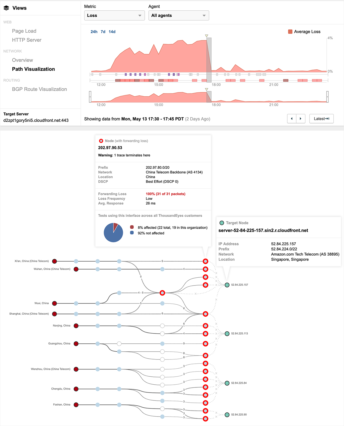 The most intensive period of the outage occurred within the first three hours after its start at 12:30 PT, but many services continued to be impacted hours later. The extended nature of the outage for one particular service can be seen in figure 3 below. Packet loss to Amazon Web Services begins to spike starting at 12:30 PT and continues for approximately five hours. The path visualization below shows network conditions between 17:30-17:45 PT, when traffic destined for AWS was continuing to get dropped by China Telecom routers.