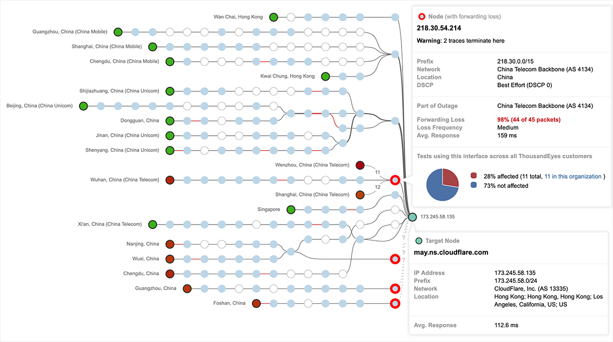 Because ThousandEyes is essentially a real-time map of the (always-changing) Internet, we’re able to track Internet outages and their global impact, whether they occur in China, Russia or elsewhere, but we can’t and won’t speculate on geopolitics and possible motivations (if any) for network events of this kind.