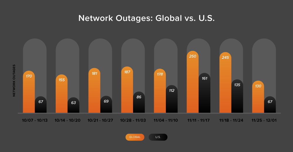 In November, there were 840 outages observed globally, marking a 6% increase from the 792 outages recorded in October. In the United States, outages rose from 333 in October to 501 in November. This trend is unusual compared to previous years, as total outages have typically decreased from October to November both globally and in the U.S.
