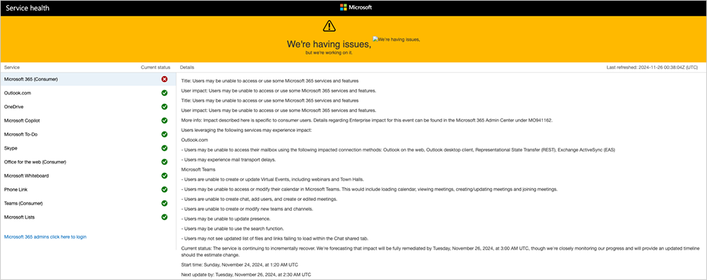Microsoft later shared more about the root cause, reporting that the problems originated from "a change that caused an influx of retry requests routed through servers, impacting service availability."