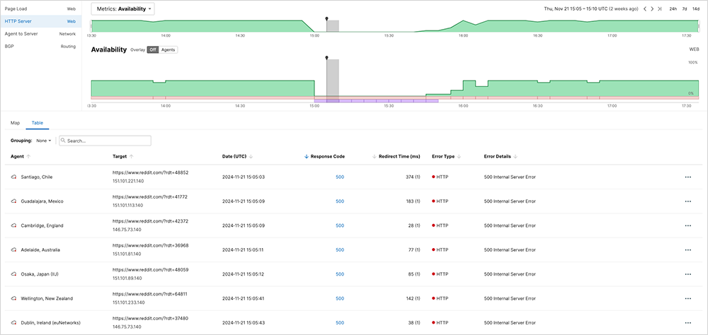 ThousandEyes observed that this issue appeared to clear around 3:05 AM (UTC) initially but reappeared around 7:00 AM (UTC), manifesting again as timeouts and service unavailability errors. The second incident seemed to affect more regions than the first, with the number of impacted services displaying a cyclical pattern—essentially, an increase and decrease in the number of impacted servers, which may indicate a backend request load issue.