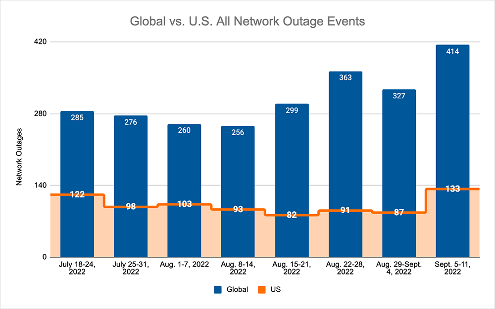 - Global outages initially dropped from 363 to 327, a 10% decrease compared to August 22-28, before rising the following week, where we observed a rise from 327 to 414, a 27% increase when compared to the previous week.