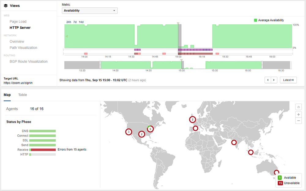 Also, on September 15, Zoom experienced a global outage that manifested as bad gateway (502) errors for users globally. ThousandEyes observed a range of impacts, with users unable to log in or join meetings. In some cases, users already in meetings were kicked out of them.