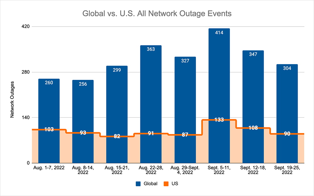 - Global outages initially dropped from 414 to 347, a 16% decrease compared to September 5-11, before continuing the downward trend the following week, where we observed a drop from 347 to 304, a 12% decrease when compared to the previous week.