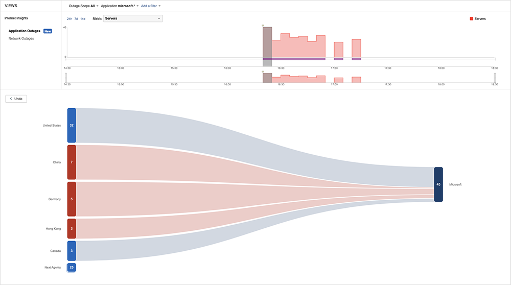 Looking at global outages across ISPs, cloud service provider networks, collaboration app networks, and edge networks, over the previous two weeks, we saw: