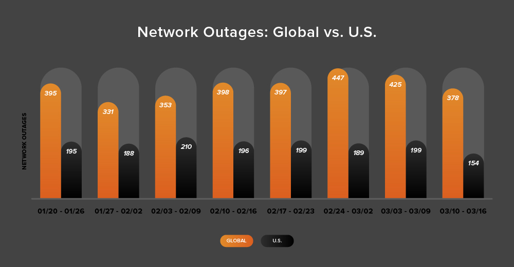 In contrast, outages in the United States followed a different pattern. Initially, they increased slightly, rising from 189 to 199—a 5% increase compared to the previous week. However, during the second week (March 10-16), outages dropped from 199 to 154, reflecting a 22% decrease.