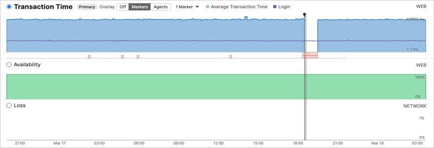 During the disruptions, ThousandEyes observed network conditions similar to those seen in a distributed denial of service (DDoS) attack, including packet loss. The objective of a DDoS attack is to overwhelm resources and temporarily disable access to a service. This can be accomplished using various techniques, with one common method being to flood the network with excessive traffic. This type of attack is often referred to as a volumetric attack, where the attack traffic competes with legitimate traffic. If the volume of attack traffic is substantial enough compared to the legitimate traffic, it can result in valid packets being dropped, leading to a denial of service for users. In this instance, the significant loss of traffic appeared to prevent users from accessing the application.
