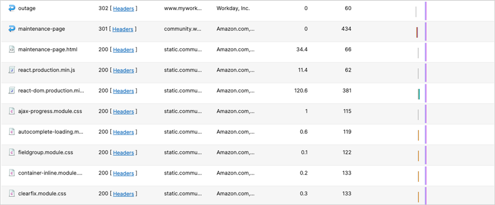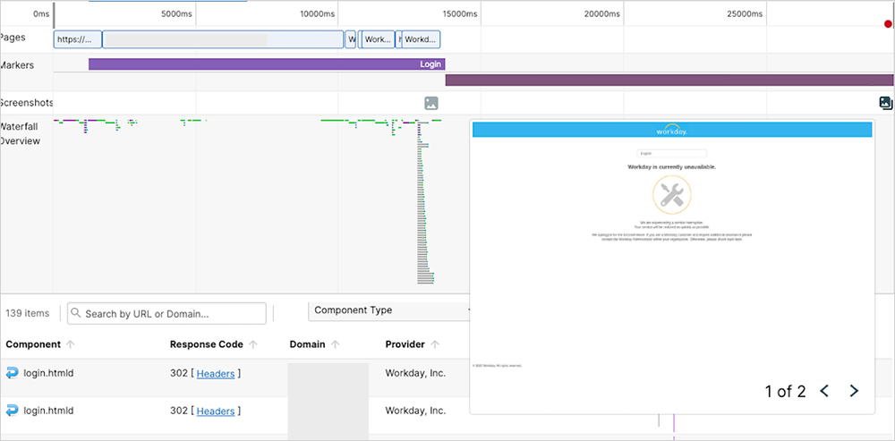 To further explore whether the fault domain was on the application side, the waterfall chart—a timeline representation of how elements of the Workday service were loaded into the browser—was examined. From this analysis, ThousandEyes observed that during the outage, after completing the login process (including associated calls), the application received an indication that there was an issue. Consequently, it redirected the request to a maintenance page on a different domain, which loaded static service-related information, including a graphic displaying a "service unavailable" error message. This redirection, occurring during the page loading process, further reinforced the conclusion that the fault domain was indeed on the application side.