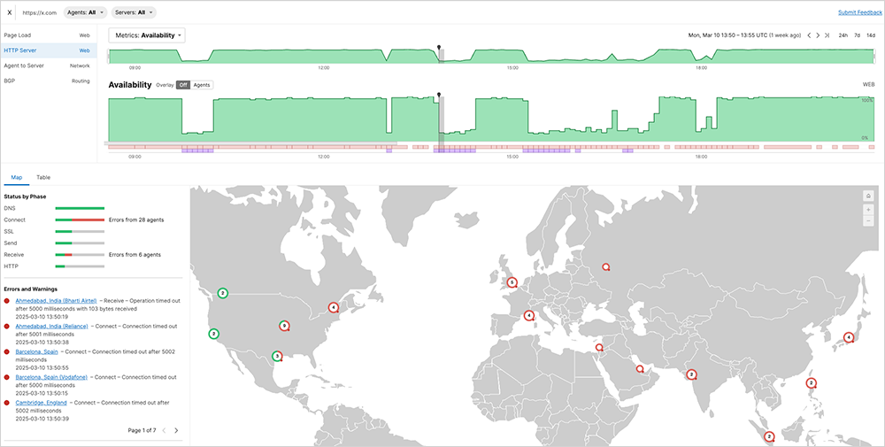Around 9:45 AM (UTC), ThousandEyes began observing a decrease in availability for X services. This issue appeared to impact multiple geographical regions and manifested predominantly as connection errors during the TCP signalling phase. Connection errors typically indicate a deeper problem at the network layer.