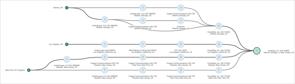 ThousandEyes observed no significant network issues, such as packet loss or increased latency, on the network paths connecting to multiple Workday data centers (see Figure 2). This absence of significant network issues, combined with the lack of service degradation on the frontend web servers, suggested that the issues were specifically related to the application itself.