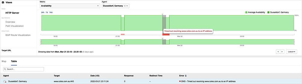 In our own monitoring, we could see name resolution failing for a number of Australian companies’ websites; however, the impact was intermittent, and not all Australian Internet users reported problems.