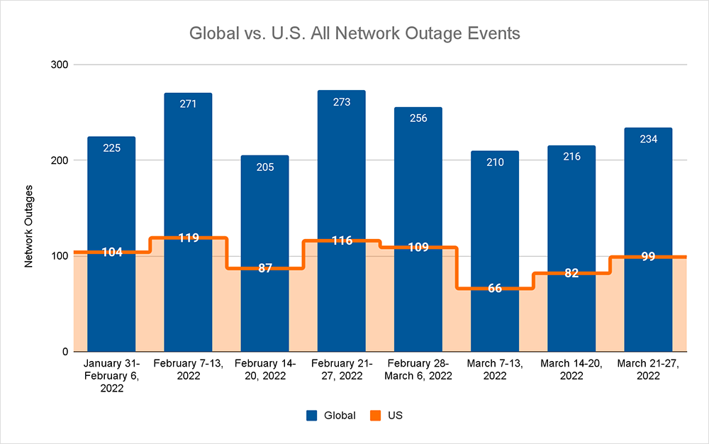 That brings us to this week's outage numbers. Globally, last week's upward trend continued as we observed total outages increase from 216 to 234, an 8% increase compared to the previous week. This increase was also reflected domestically, where outages numbers rose from 82 to 99, a 17% increase compared to the prior week. When we look at total global outages, the proportion of U.S. outages also increased this week to 42%, which is 4% higher than the previous week, where it was only 38%. This increase means that the levels continue to trend toward the average percentages we saw across 2021.