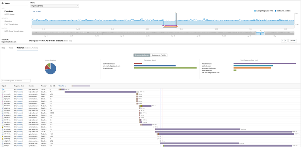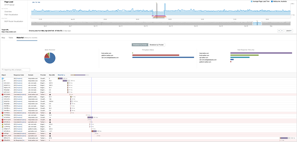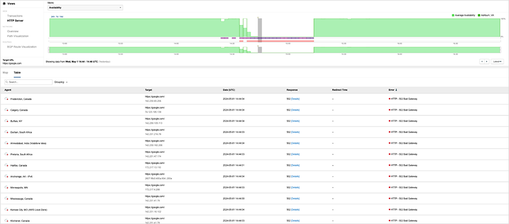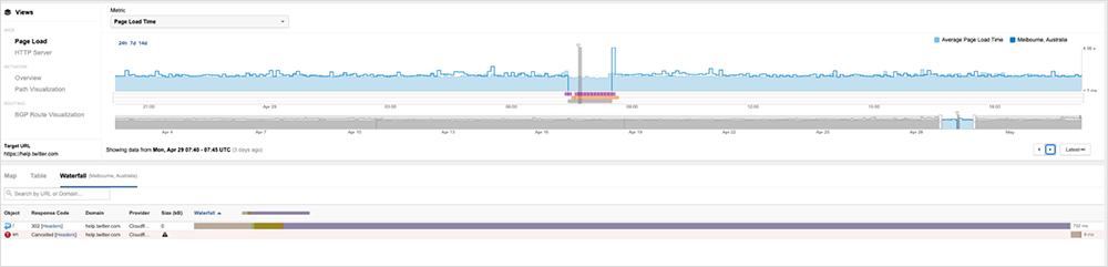 In situations like this, we would usually expect to see an error message such as HTTP 503 Service Unavailable or 502 Bad Gateway. Sometimes, as we have seen with X in the past, a 302 (or 307) redirect to a static error message (such as X’s classic ice cream-themed error page) may indicate that there is an issue. However, in this particular case, we observed that for some connections, the redirection simply timed out. Based on the data available on the ThousandEyes platform, it appeared that the redirection continued to attempt to retrieve and request content as normal. In other words, it did not appear to redirect to the static error message page.