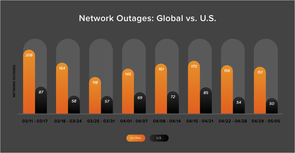 From April 22 to May 5, only 34% of network outages occurred in the United States, breaking the trend of at least 40% of all observed outages being U.S. centric.