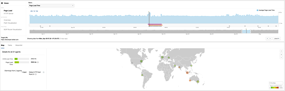 ThousandEyes detected an outage affecting X (formerly Twitter) at around 7:15 AM (UTC) on April 29 that prevented some users from interacting with the service. Requests to the application kept timing out, indicating an issue with the service’s backend. The service outage was resolved at approximately 8:30 AM (UTC).