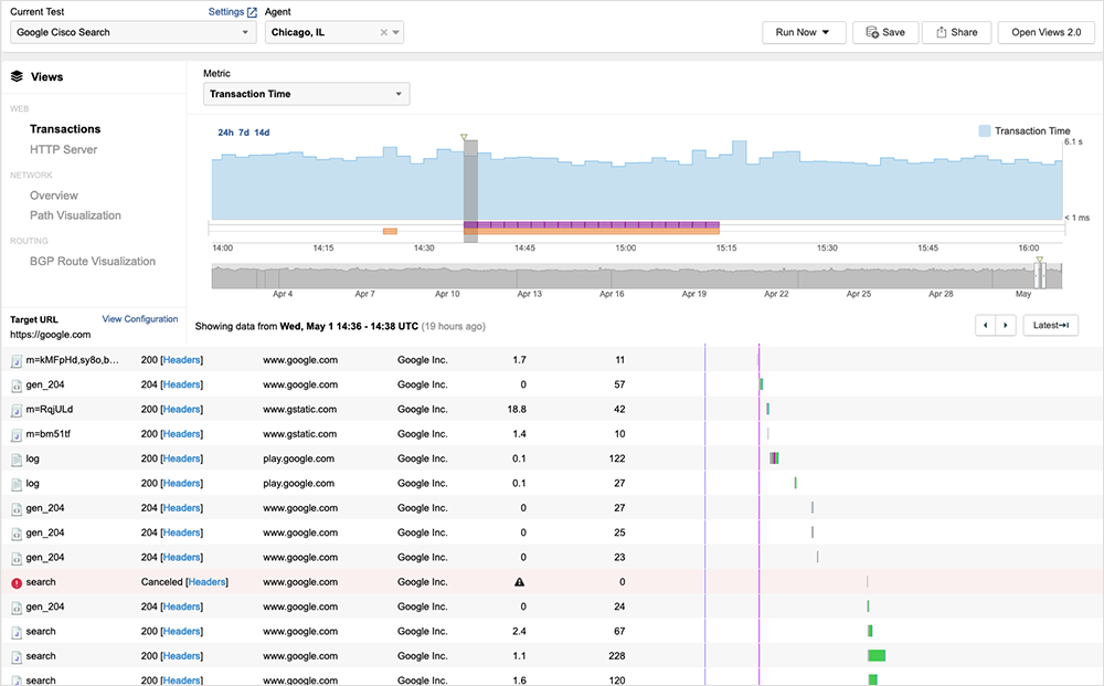 The normal search process involves visiting the search page, submitting a search query, and receiving the results. During the outage, users appeared to be able to reach the search page but encountered errors when attempting to do anything beyond that. The incident was resolved around 3:15 PM (UTC). (Explore this outage further in the ThousandEyes platform.)
