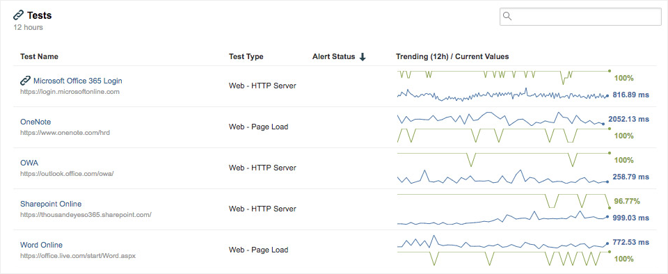 Office 365 apps have their own distinct URLs and delivery architectures. Hence it is important to monitor each application separately. Some can be logically grouped; for example, the Live apps are all hosted on a common platform and share a hostname. However, Sharepoint Online, Exchange Online, OneNote and Azure Active Directory (AD) are all distinct URLs.