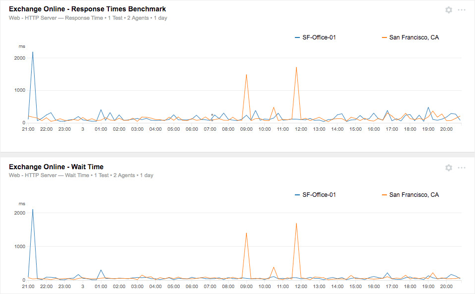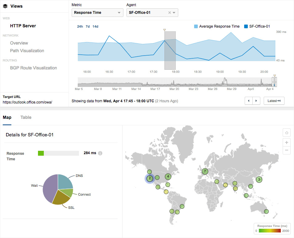 Slow response times can be caused by a number of factors ranging from DNS resolution problems, to network delays to application wait times. It’s important to understand this because they’re all potentially managed by different groups and vendors. A Microsoft support ticket won’t help you much if the problem is a network delay caused by your ISP. Conversely, your ISP cannot really help with your Office 365 performance problem if the issue is a long application wait time. Visibility is key to developing effective operational processes around Office 365, cut down your MTTT and MTTR, and minimize helpdesk costs.