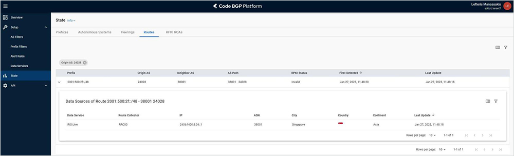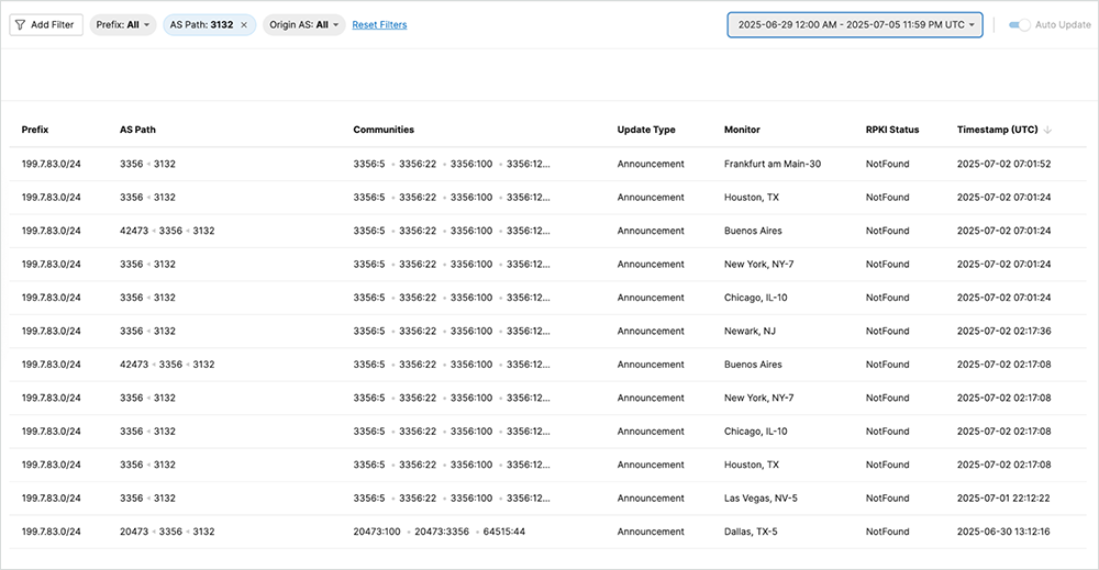 Our newly introduced BGP Updates table was created for this exact use case: When BGP anomalies occur, you are able to drill down to the level of raw BGP updates and understand what happened. In the example in Figure 8 below, we have used the BGP Updates table filters to look for AS paths that include AS 3132 anywhere in the path during the previous week. We notice that this AS is originating the prefix (rightmost AS), and the network that always receives and propagates the announcement is Lumen (AS 3356). The prefix is not covered by an RPKI ROA; therefore, the RPKI status is “NotFound.”