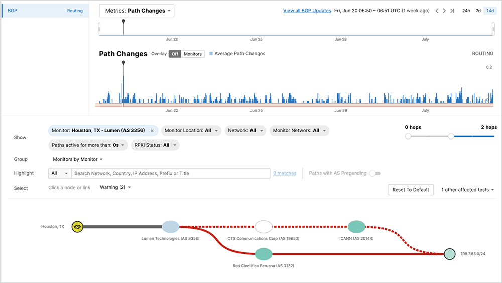 If we narrow our focus to the changes in paths observed by a single BGP monitor that has visibility of the event, for example, our monitor in Houston, TX, from Tier 1 ISP Lumen (AS3356), we clearly see the offending network (AS3132 Red Cientifica Peruana) originating the prefix on June 20, as well as the legitimate path being withdrawn in favor of the offending one.