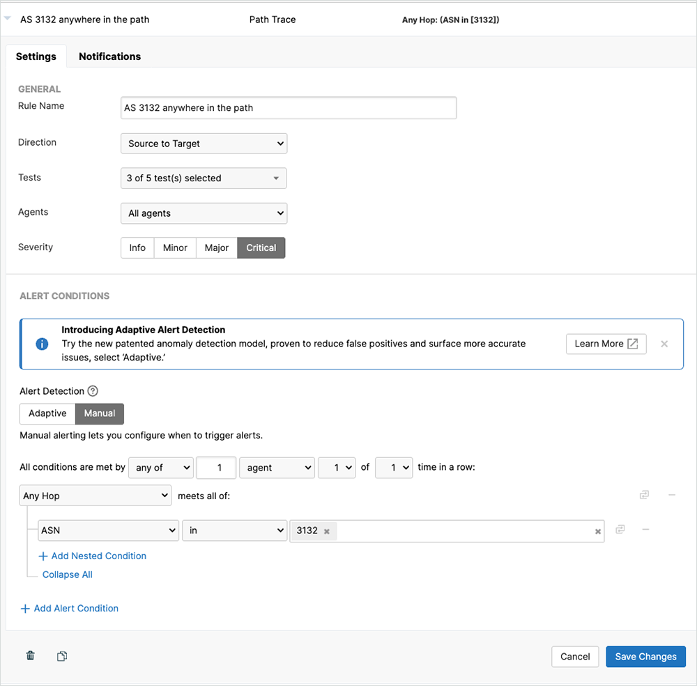 Additionally, to receive alerts when AS3132 appears in the AS path, we established an associated path trace alert rule.