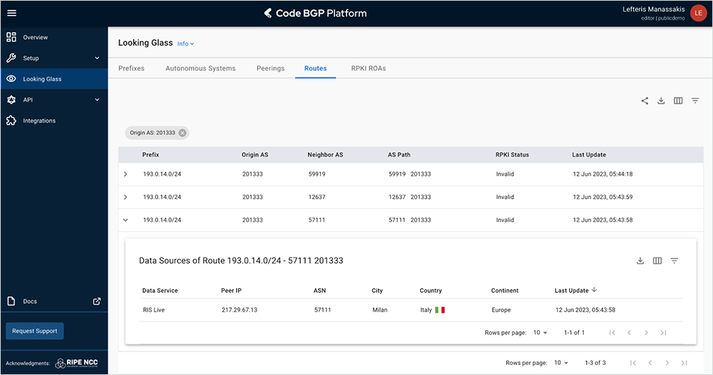 On June 12, 2023, the platform detected that AS201333 (Naquadria S.R.L.) appeared as the origin of prefix 193.0.14.0/24, which belongs to RIPE NCC and is the IPv4 prefix of the “K-Root” domain server.