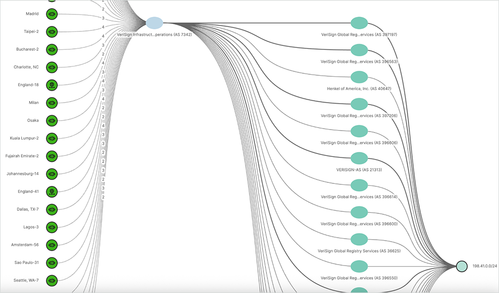 The BGP Route Visualization view of the ThousandEyes platform, as shown in Figure 1, illustrates Verisign’s deployment and makes it easier to comprehend. This example involves A-Root.