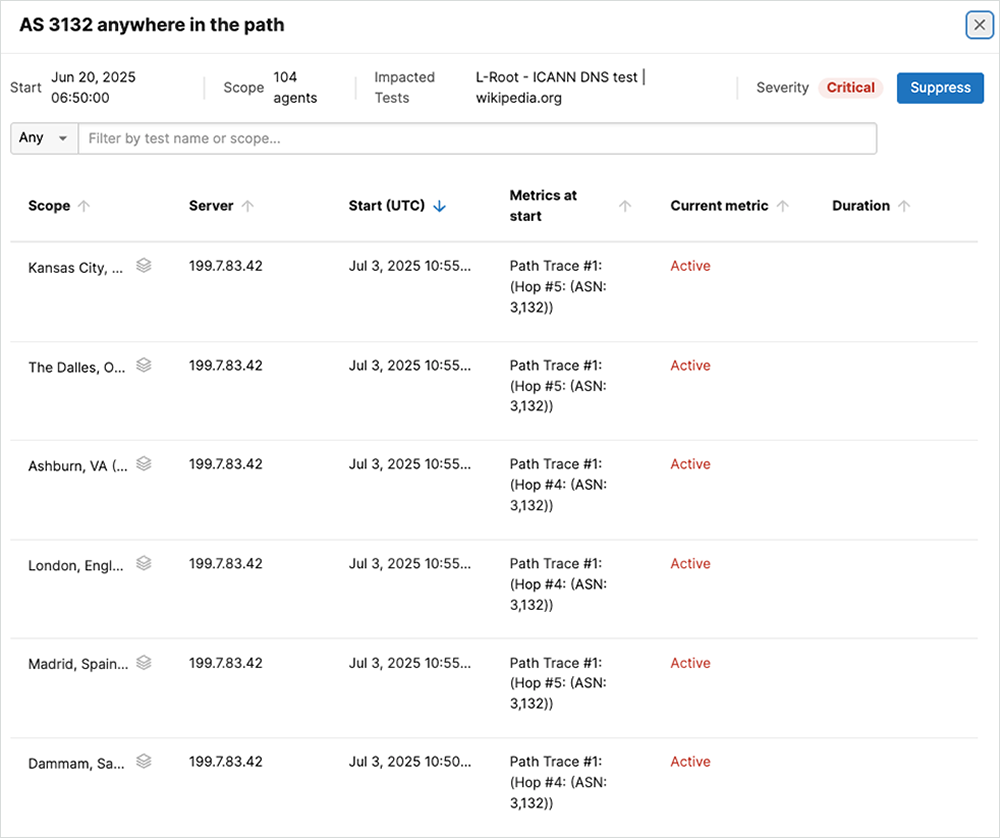 Previously, our monitoring approach focused exclusively on detecting anomalies in the control plane. We have since expanded our methodology to utilize the comprehensive ThousandEyes platform for root DNS prefix monitoring. This evolution has allowed us to move beyond control plane analysis by incorporating data plane measurements, providing a more complete view of BGP events and their real-world impact. Using this enhanced approach, we have identified another event involving L-Root, which we describe in detail below.