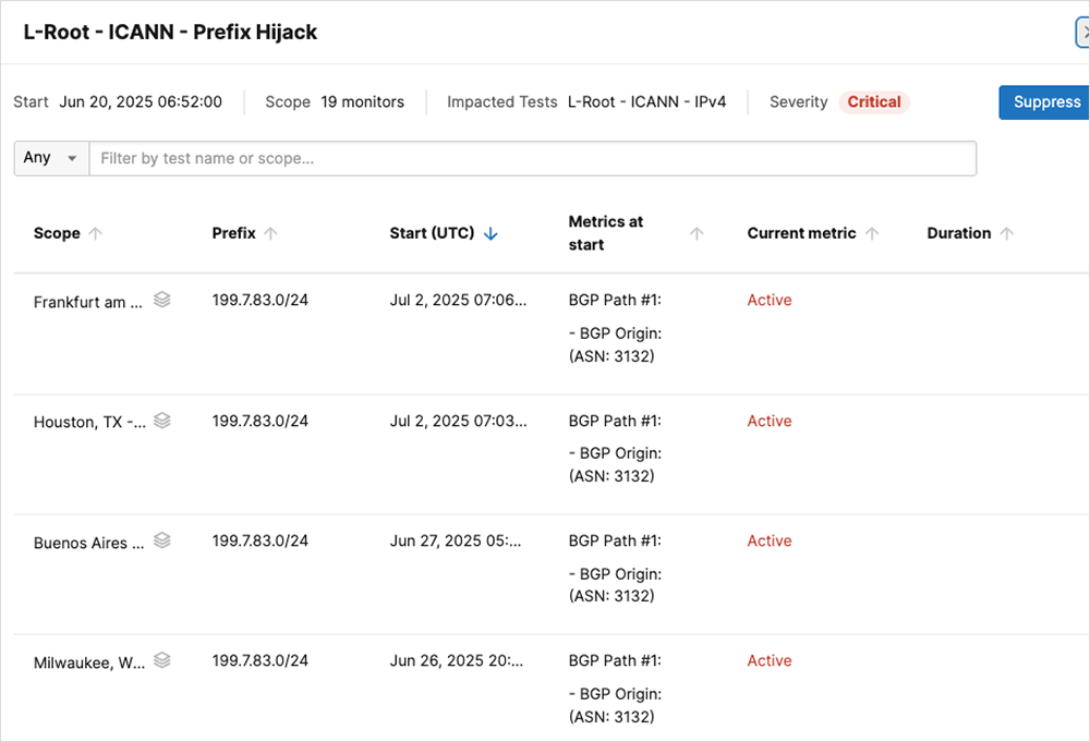 Since June 20, 2025, the Cisco ThousandEyes platform has detected that AS3132 (Red Cientifica Peruana) is appearing as the origin of prefix 199.7.83.0/24, which again belongs to ICANN (AS20144) and is the IPv4 prefix of the “L-Root” domain server.