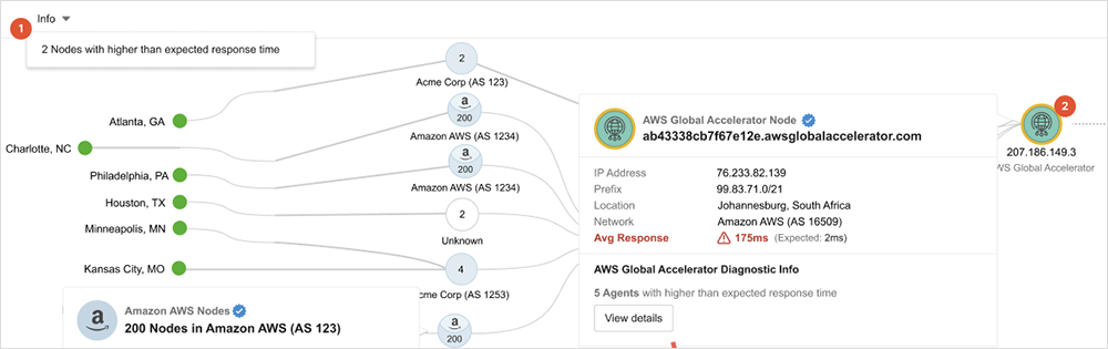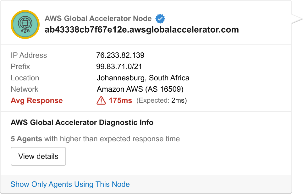 AWS Network Path Enrichment will identify Global Accelerator nodes within a path visualization and display discovered performance and statistics about them. One important metric here is observed versus expected TCP latency. In situations where a Global Accelerator is being used, ThousandEyes runs an end-to-end test between an agent and the end destination to determine actual TCP latency. This is then compared against the expected value as retrieved from the AWS API. These two values are then compared to show any discrepancies, indicated by a yellow ring around the Global Accelerator node icon.