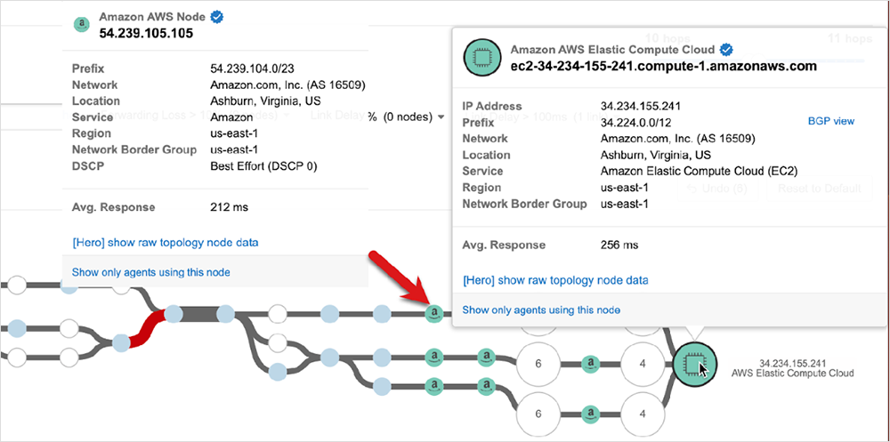 In addition to providing critical service and node identification for monitored traffic that is traversing through the AWS network, ThousandEyes also has Cloud Agents deployed in many AWS regions that let you test performance and simulate user experience to and from these locations.