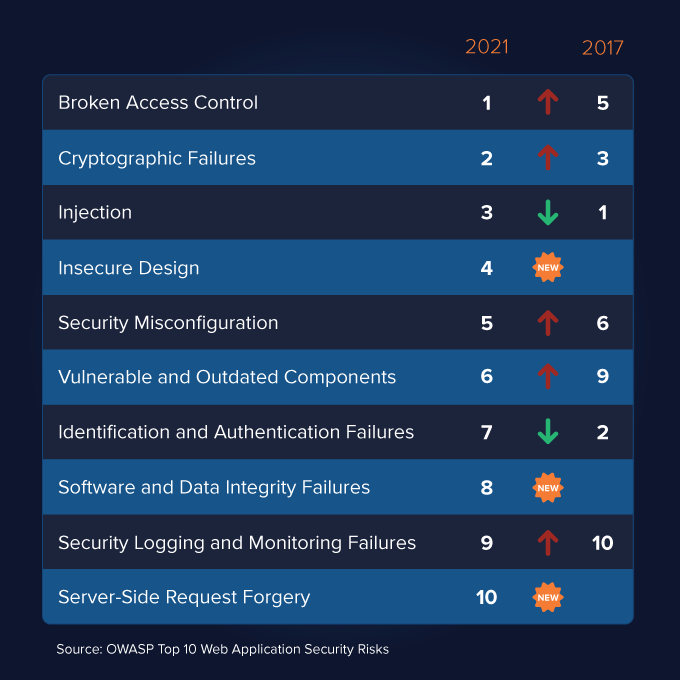 This legendary line from the feature film Hackers perfectly encapsulates why organizations like the Open Web Application Security Project (OWASP) release updated category ranking of the top ten vulnerabilities plaguing the world wide web, the latest being for 2021-2022. Allow us to show you how they have changed since last published in 2017 in Figure 1 below.
