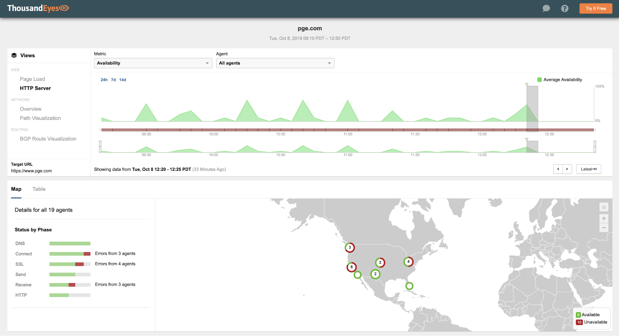However, around 1AM PST on Wednesday morning (about 4 hours after activating the F5 DDoS service) things start to improve, and by 1:20 AM PST, pge.com website had nearly 100% availability and accessible from ThousandEyes vantage points. We can see this in the page load geographic map in Figure 10 below.