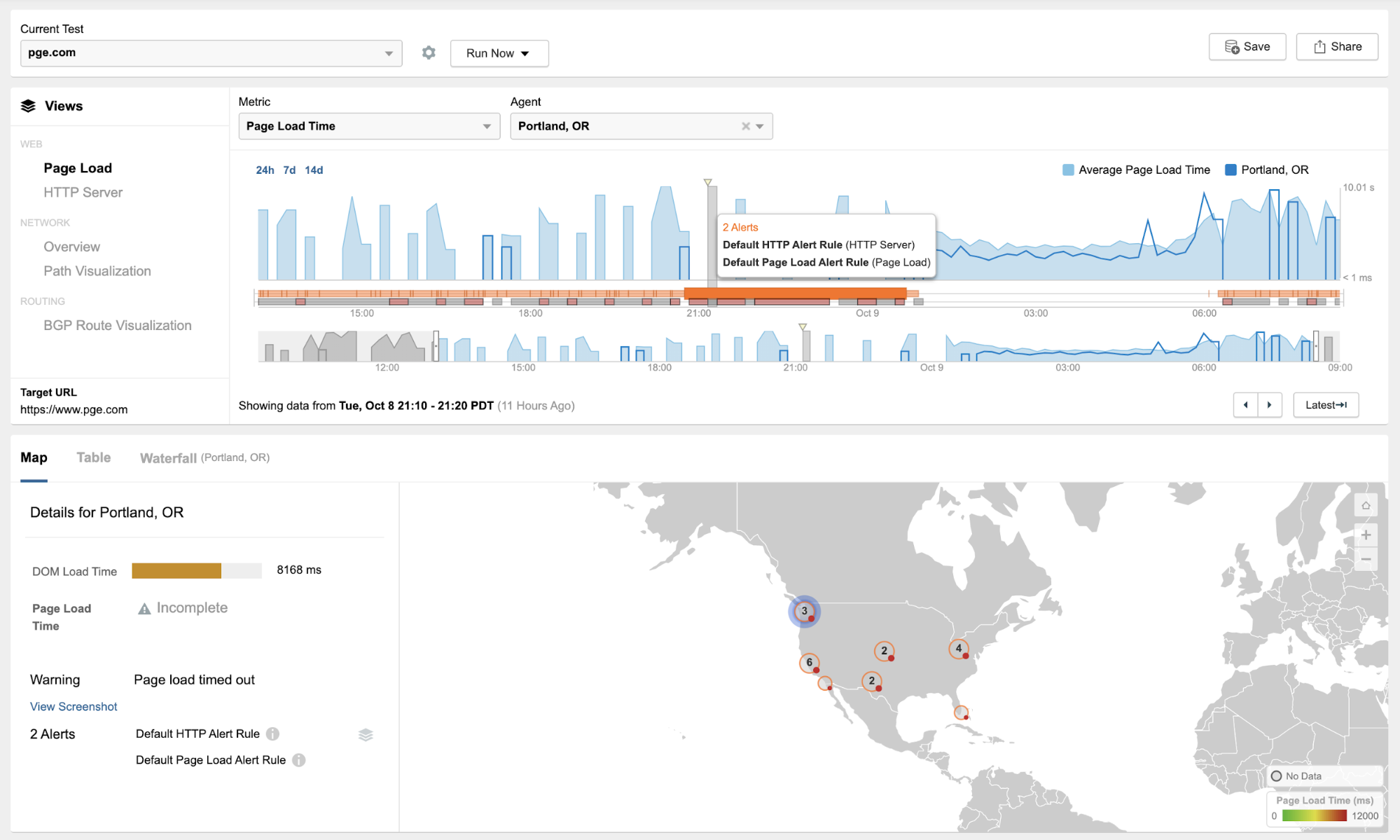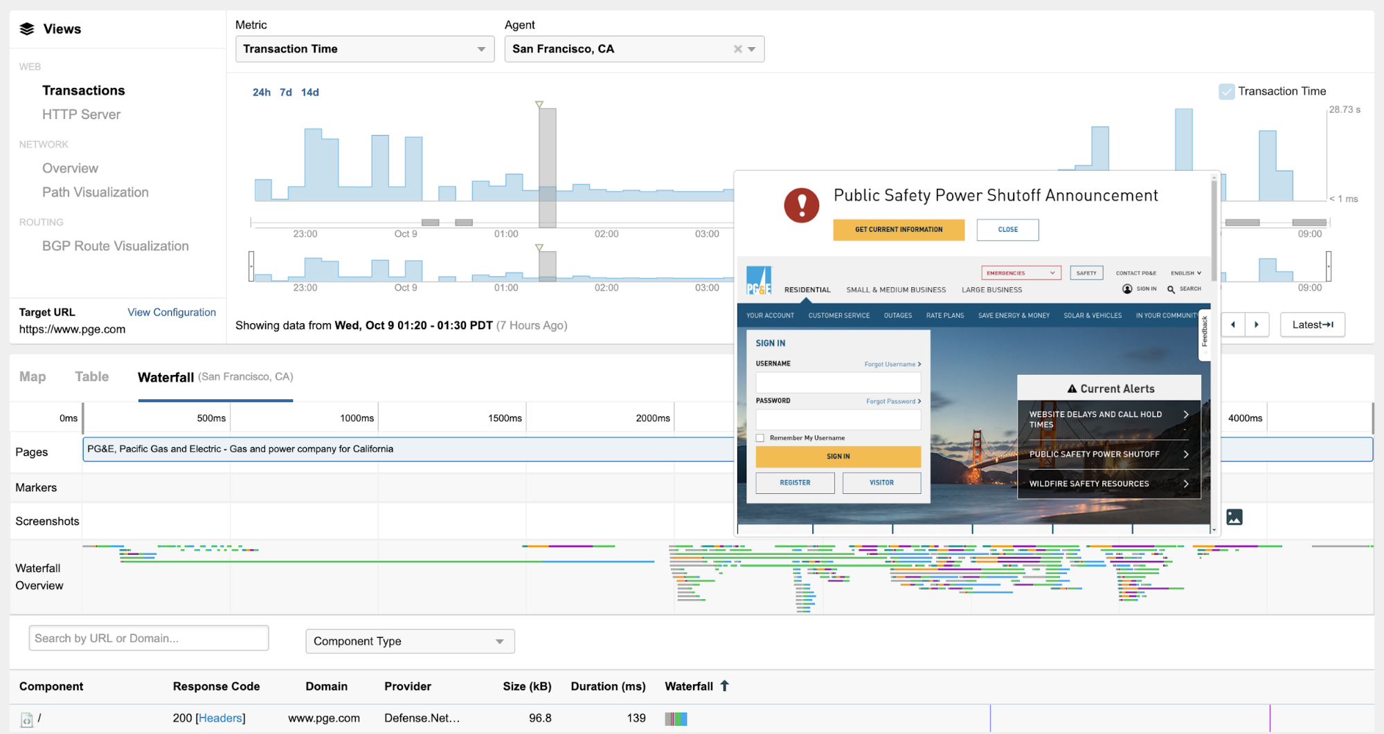 At the same time, ThousandEyes' application layer transaction test from our San Francisco vantage point confirms PG&E’s website is accessible (Figure 11). We also see from the waterfall view that during this time the PG&E site is being served by F5’s mitigation service (Defense.net).