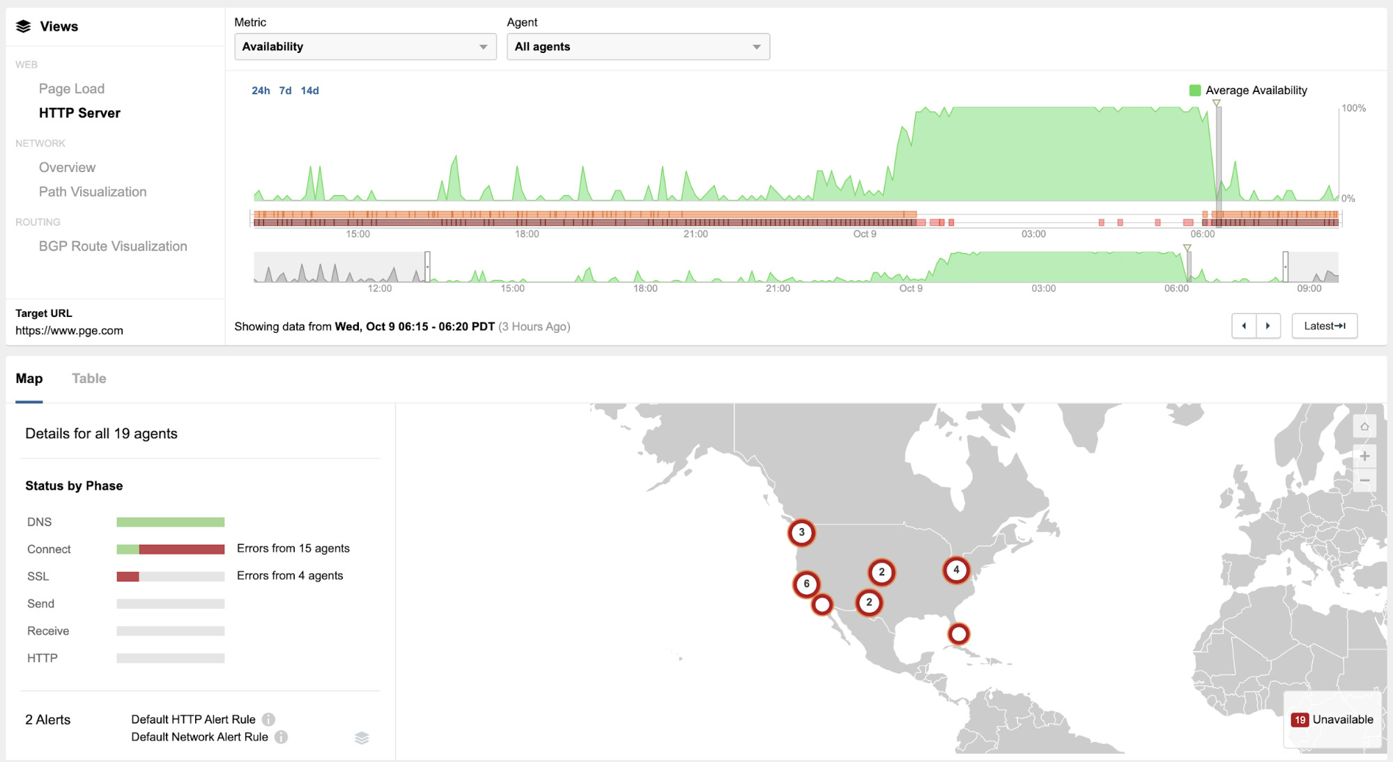 At the web application layer, ThousandEyes observed widespread and consistent availability issues where attempts to load PG&E's web page would result in either connection timeouts or SSL certificate errors (Figure 1).