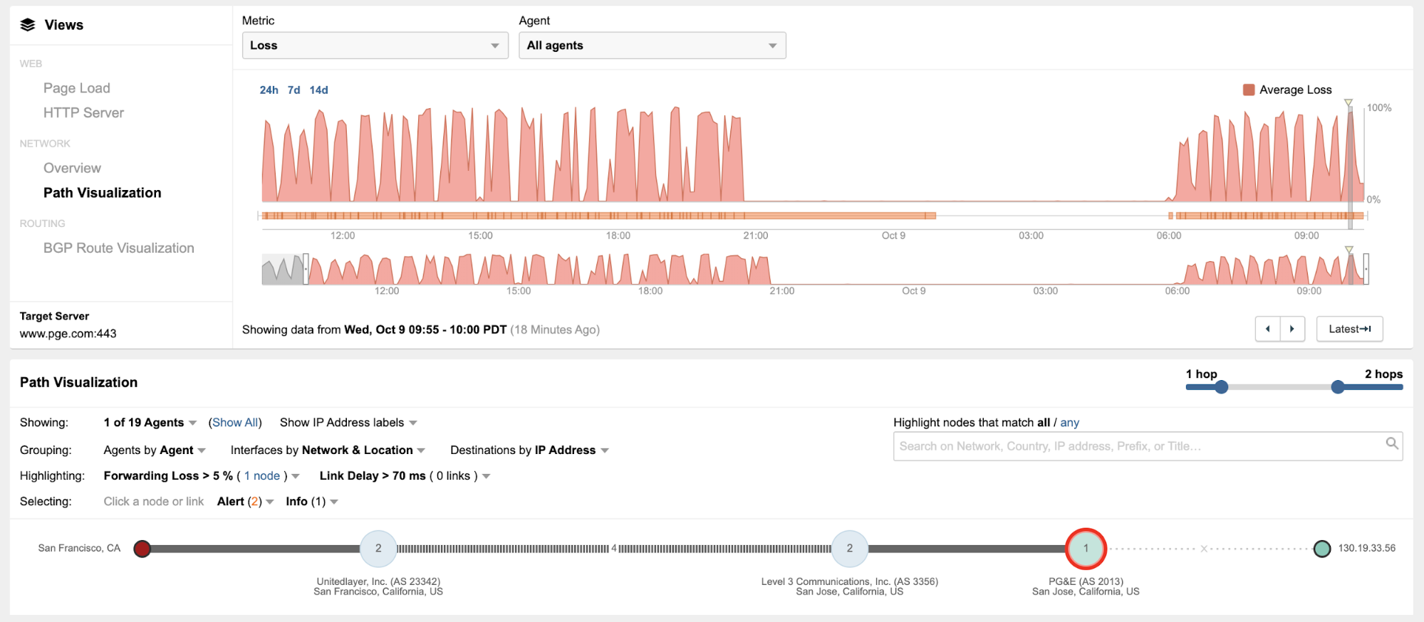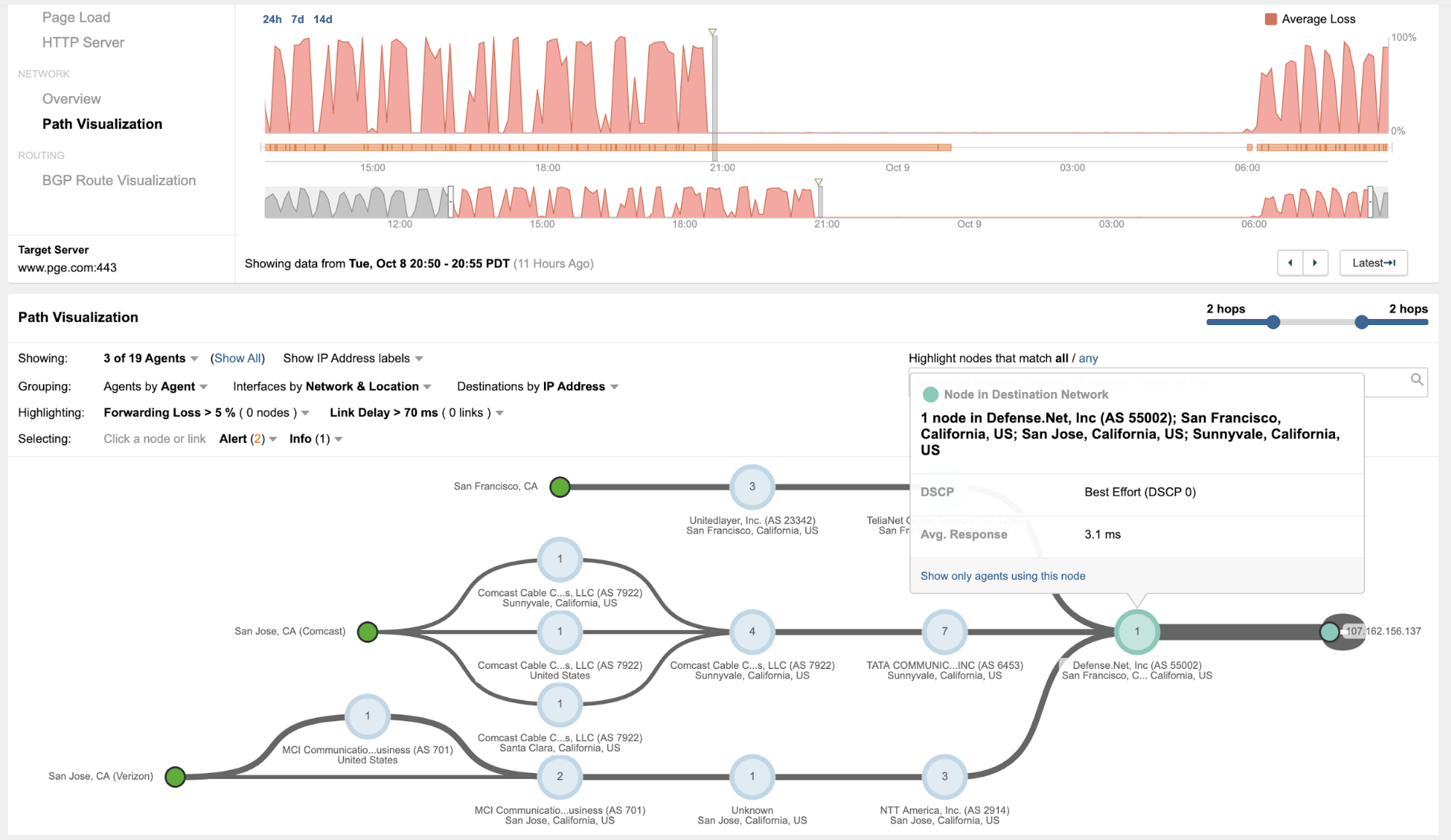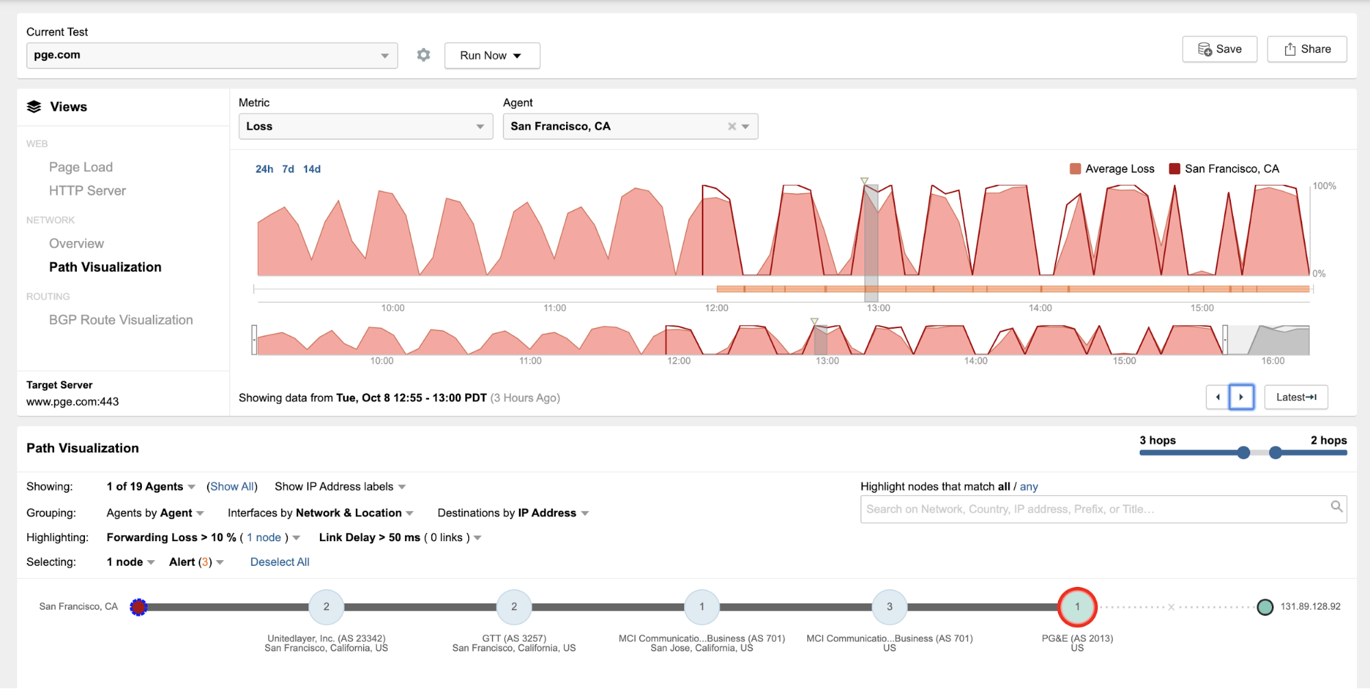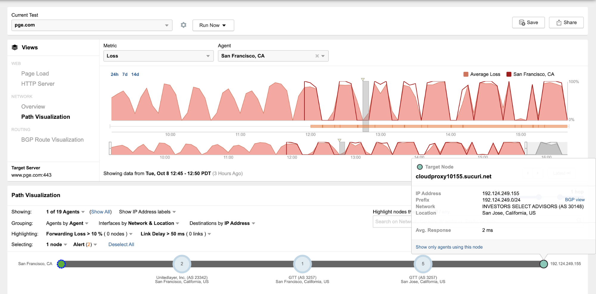 At the network layer, ThousandEyes saw network traffic targeting PG&E's website cycling between PG&E's data center and what appears to be PG&E's DDoS mitigation provider (Sucuri). Traffic targeting PG&E's network (AS 2013) experienced significant network packet loss, whereas traffic targeting Sucuri did not. Taking a look at one of ThousandEyes vantage points from San Francisco, we can clearly see the oscillation pattern (Figures 2 and 3 below), which appears to occur roughly every 30 minutes.