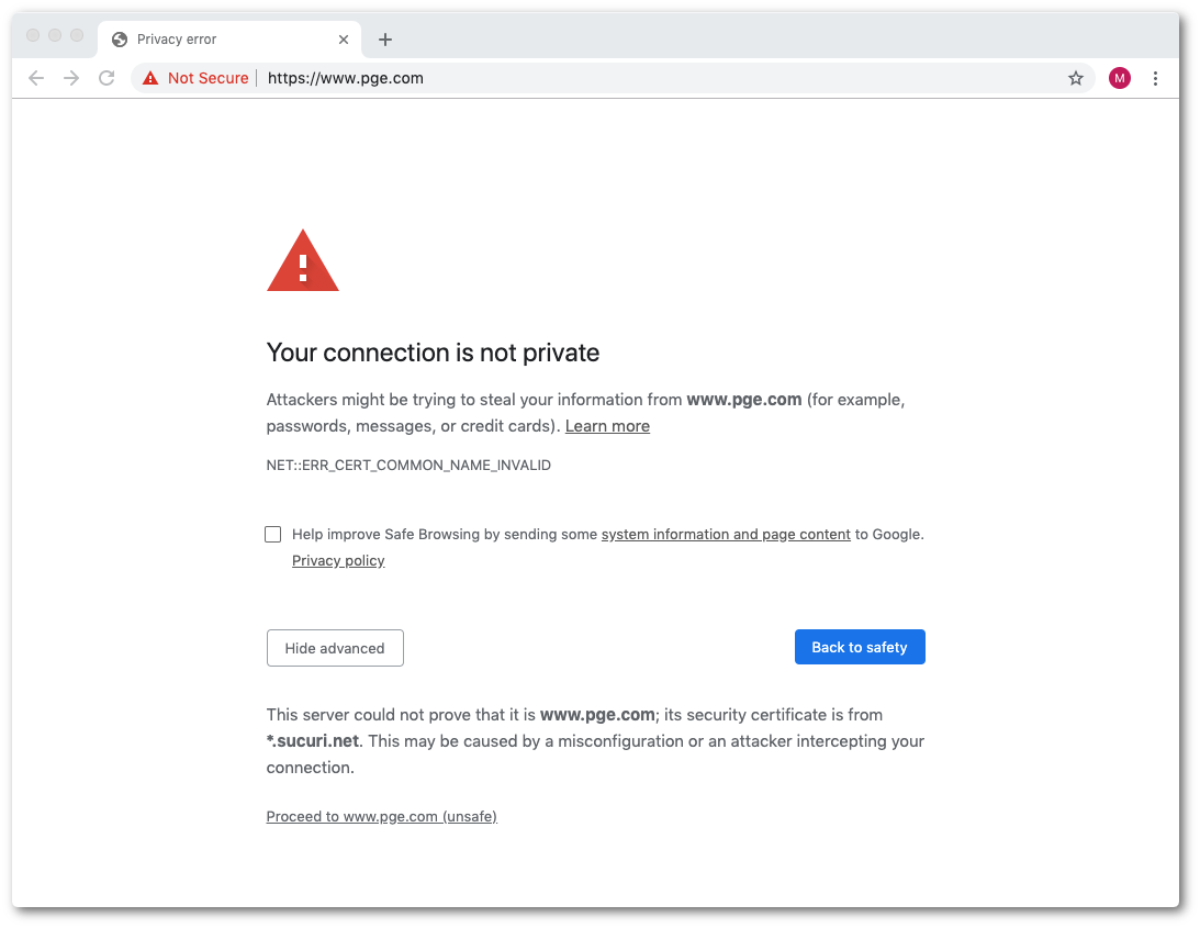 Starting early Tuesday morning, consumers from California and across the United States were unable to reliably reach the PG&E website. At the time of publishing, the issue is still ongoing. While the primary cause of the outage appears related to congestion in the PG&E data center, it also appears that a misconfiguration of PG&E's DDoS mitigation service (Sucuri) is resulting in users seeing HTTPS (SSL) certificate errors.