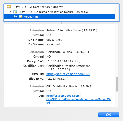Viewing the certificate from the browser would confirm that the DNS Names field did not contain "www.pge" or "pge.com." Instead they were only referencing the wild card *.sucuri.net, as seen in Figure 6.