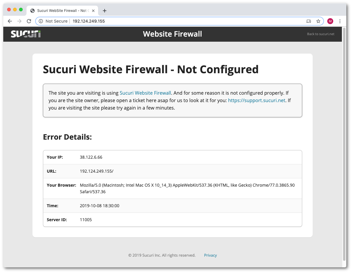 It certainly is odd that a mitigation provider wouldn’t have a proper SSL certificate in place for a client website. So, we dug a bit further. Based on the network path view shown in Figure 3, we know that when "pge.com" traffic is being redirected to Sucuri, traffic is targeted to the following IP address: 192.124.249.155. We tried connecting directly to this site using HTTP (rather than HTTPS, so no SSL certificate will be required), and that resulted in being served a firewall configuration error page, as seen in Figure 7.