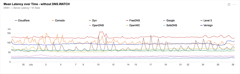 If we look at mean latency over time, we see that overall performance is relatively stable, particularly for the top five performers. One obvious exception is DNS.WATCH, where we observed extremely high latency between July 14-18. It’s unclear what led to this prolonged performance degradation, but once resolved, it returned to its previous performance baseline, which slightly outperformed FreeDNS.