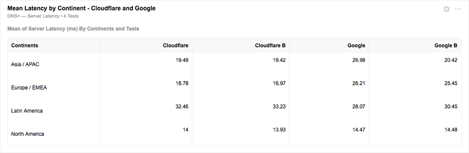 Performance is similar between the primary and secondary service, with less than a 2 ms gap between them, with the exception of Google’s 4.4.4.4 in APAC, which is on average 6.56 ms faster.