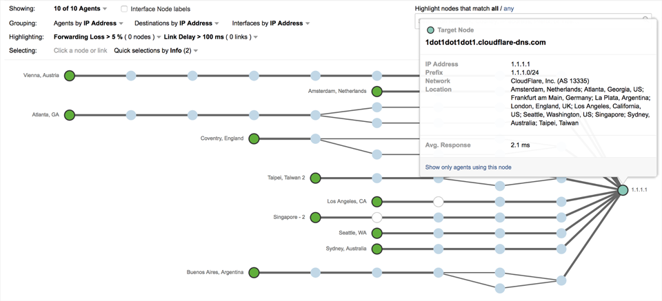 Cloudflare is one of the top Content Delivery Network (CDN) providers, so it’s able to leverage its massive network of over 150 data centers around the globe to resolve queries very close to end users. If we look at the hop-by-hop network path between monitoring points in multiple cities and 1.1.1.1, we can see that records are being served up very close to where the query is originating—in most cases in the same city. Cloudflare accomplishes this using anycast, which directs users to the optimal data center in order to minimize latency.