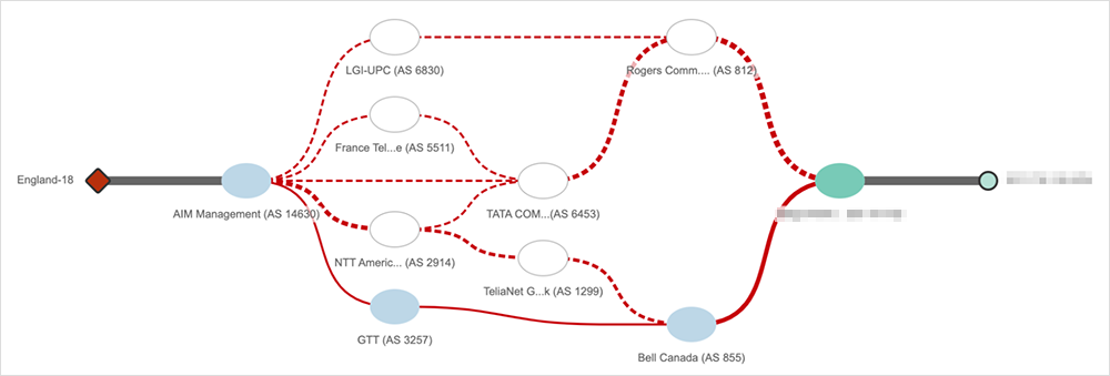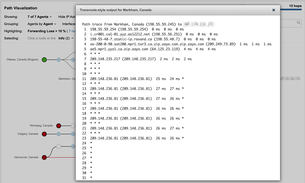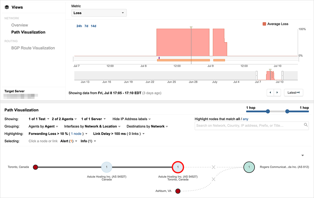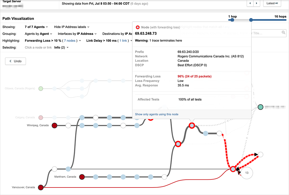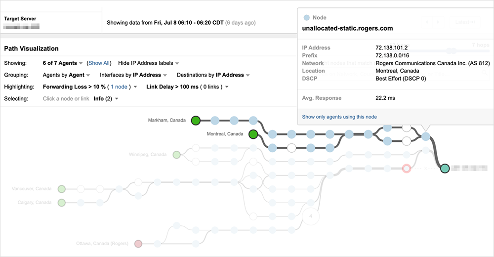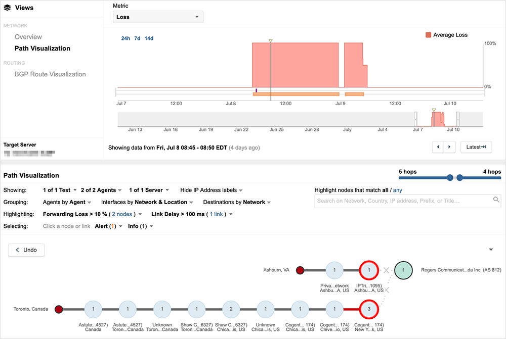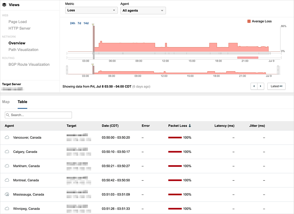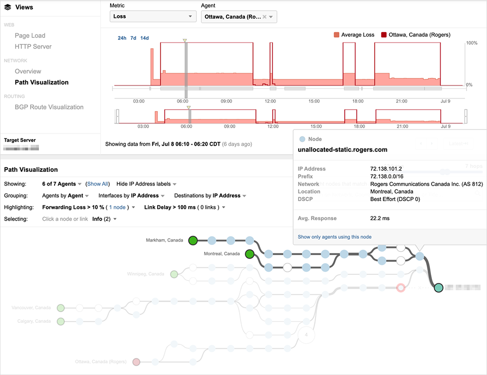 As the incident unfolds, most traffic destined to the customer is going through Rogers’ network compared to Bell Canada, so once the incident starts, 100% packet loss is observed across most paths.