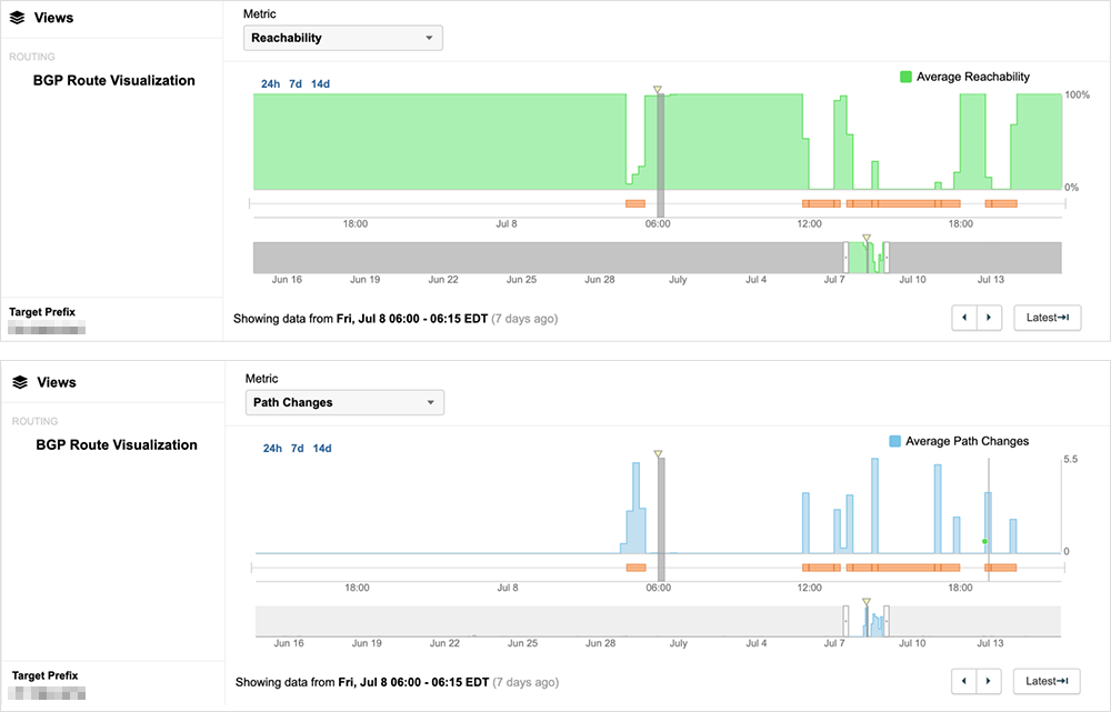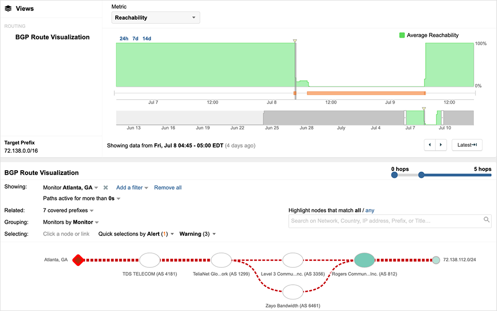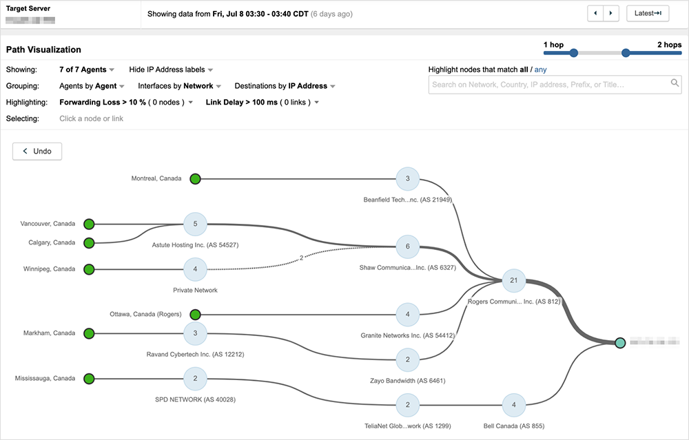 Last week, in the early hours of July 8th (04:44 EDT / 08:44 UTC), ThousandEyes began observing BGP routing instability caused by the withdrawal of large numbers of Rogers Communications (AS 812) prefixes.