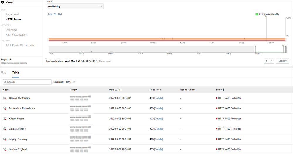 Traffic blackholing implemented at the ISP level, as appears to be seen with the government entity website, is a technique often used to combat DDoS attacks, even though it can be imprecise and cause significant collateral damage in preventing non-attack traffic to reach a site. Despite these downsides, ThousandEyes has observed blocking patterns across many sites in Russia as well as Ukraine over the last couple of weeks that are consistent with traffic blackholing implemented via ISPs.