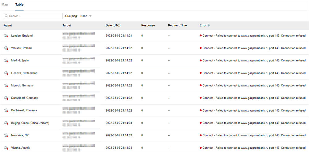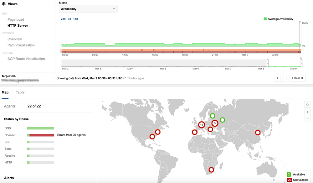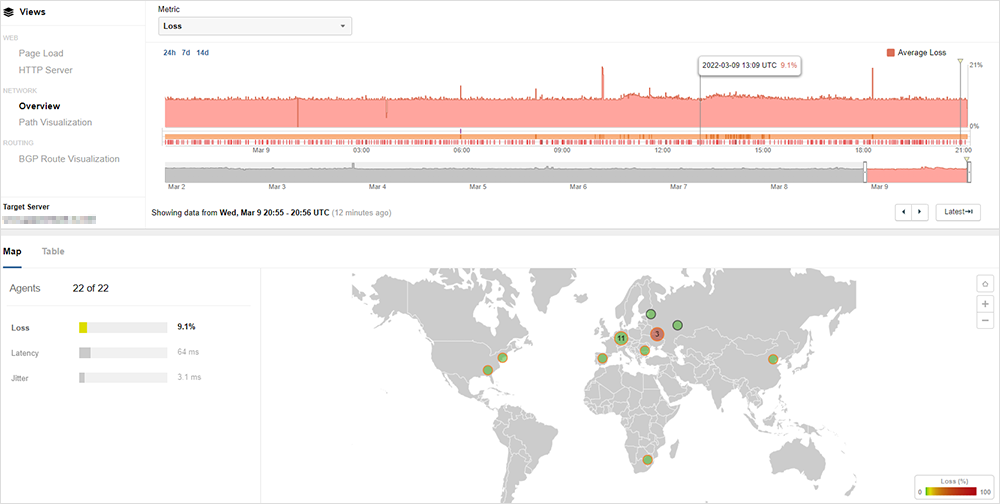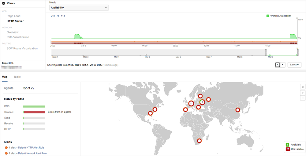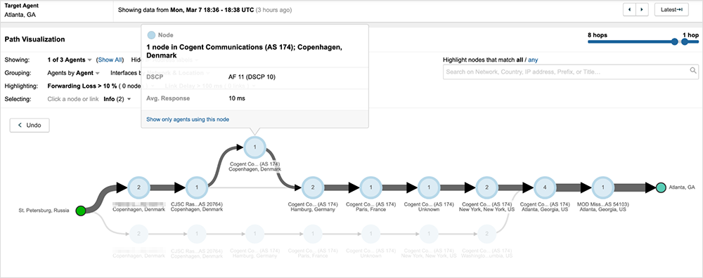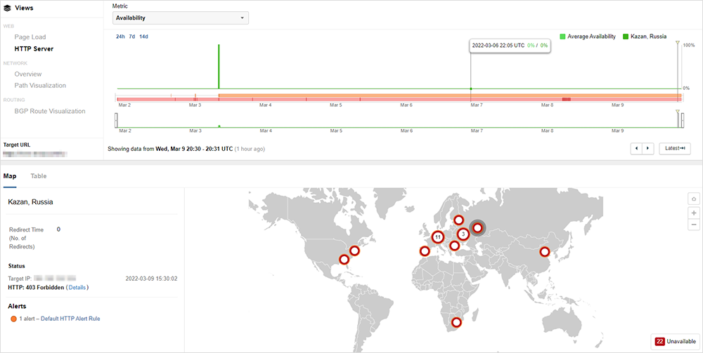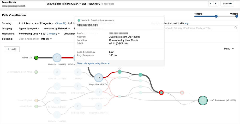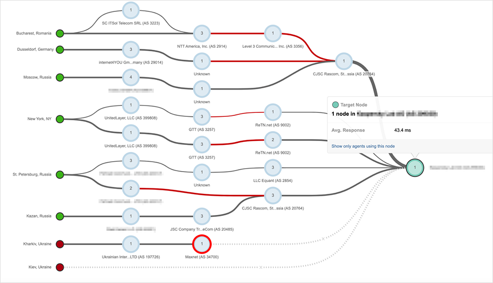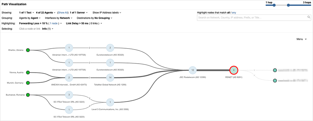 ThousandEyes has been actively monitoring Internet conditions in Russia over the last several weeks to understand the health of backbone connectivity keeping Russia connected to the world, as well as the availability of sites for users both in and out of Russia, when traversing between the Russian Internet and global Internet. This analysis is ongoing, and we will update our findings as conditions change.